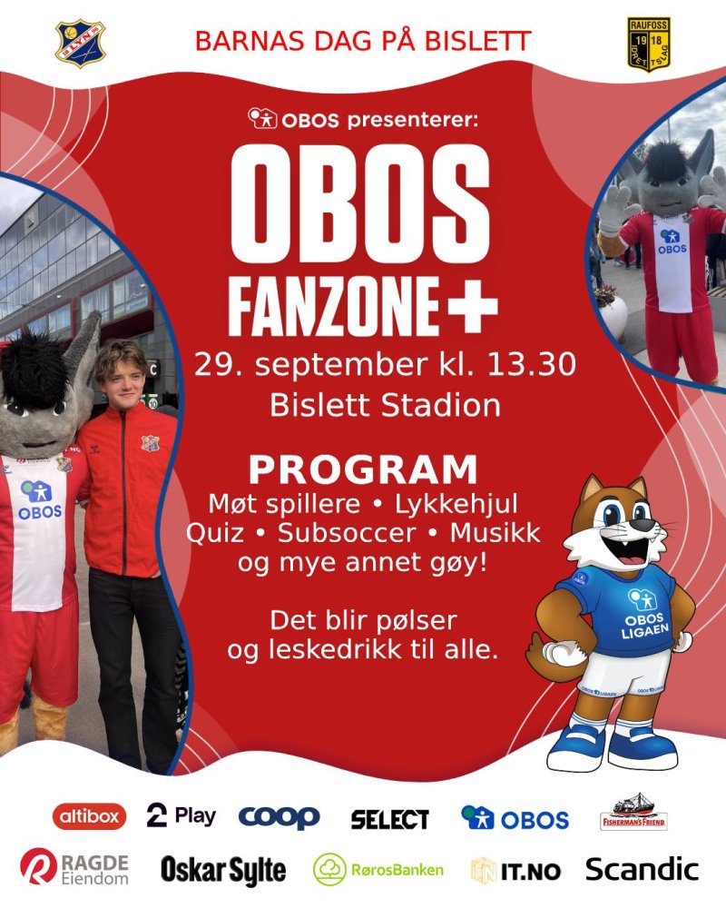 Før kampen mot Raufoss blir det fult liv med OBOS-Fanzone på indre bane. Det blir masse lek og moro med quiz, triksing, hastighetsmåler, subsoccer, lykkehjul og mye mer. Vi avslutter fanzonen med pølser fra Leiv Vidar og leskedrikk fra Oskar Sylte før vi setter oss på tribunen for å se kampen.